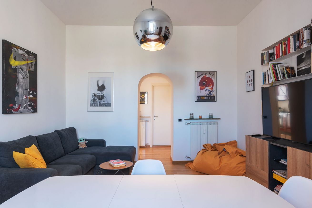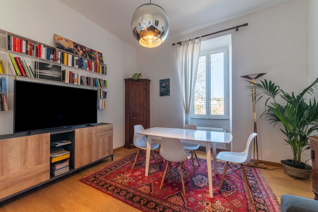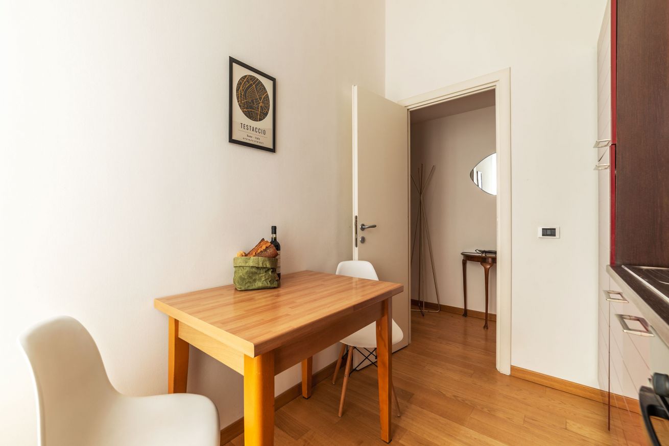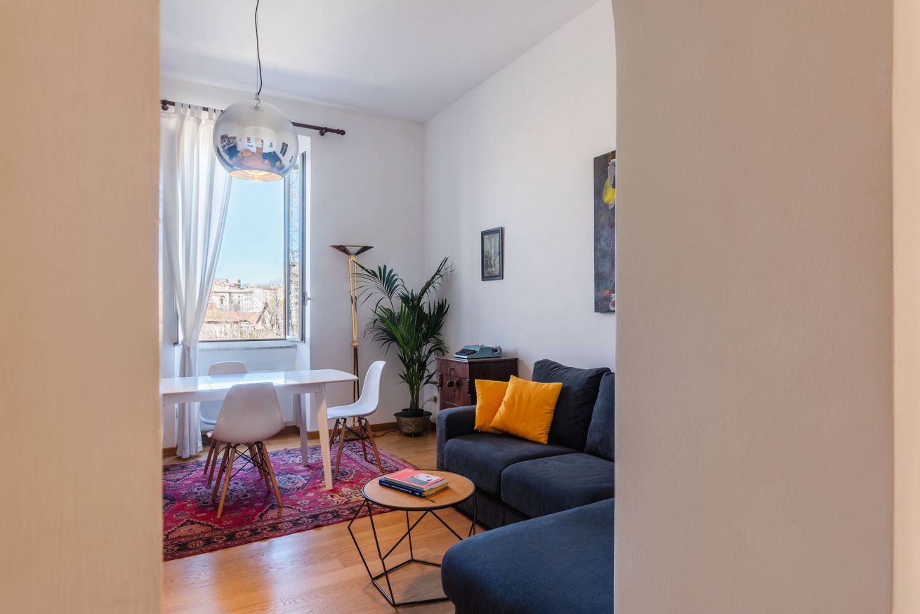 Nel cuore di Testaccio, a due passi da Trastevere e dal centro storico, questo appartamento con vista sul Tevere vi consentirà di godere a pieno del vostro soggiorno romano. L’appartamento è posto al terzo piano (con ascensore in costruzione) di una palazzina in mattoni di inizio Novecento, caratterizzata da un tipico cortile interno. L’appartamento è composto da 3 ambienti: un ampio e luminoso salotto con divano a 3 posti, tavolo da pranzo e TV; una camera da letto matrimoniale con armadio e affaccio sul silenzioso cortile interno; una cucina abitabile con tavolo da pranzo. Infine, un bagno moderno con un’ampia doccia. Il divano è trasformabile in un divano letto. La casa, ristrutturata di recente ed arredata con gusto con pezzi moderni di design e mobili antichi, dotata di ottimo Wifi e Aria condizionata, può ospitare fino ad un massimo di 4 persone.